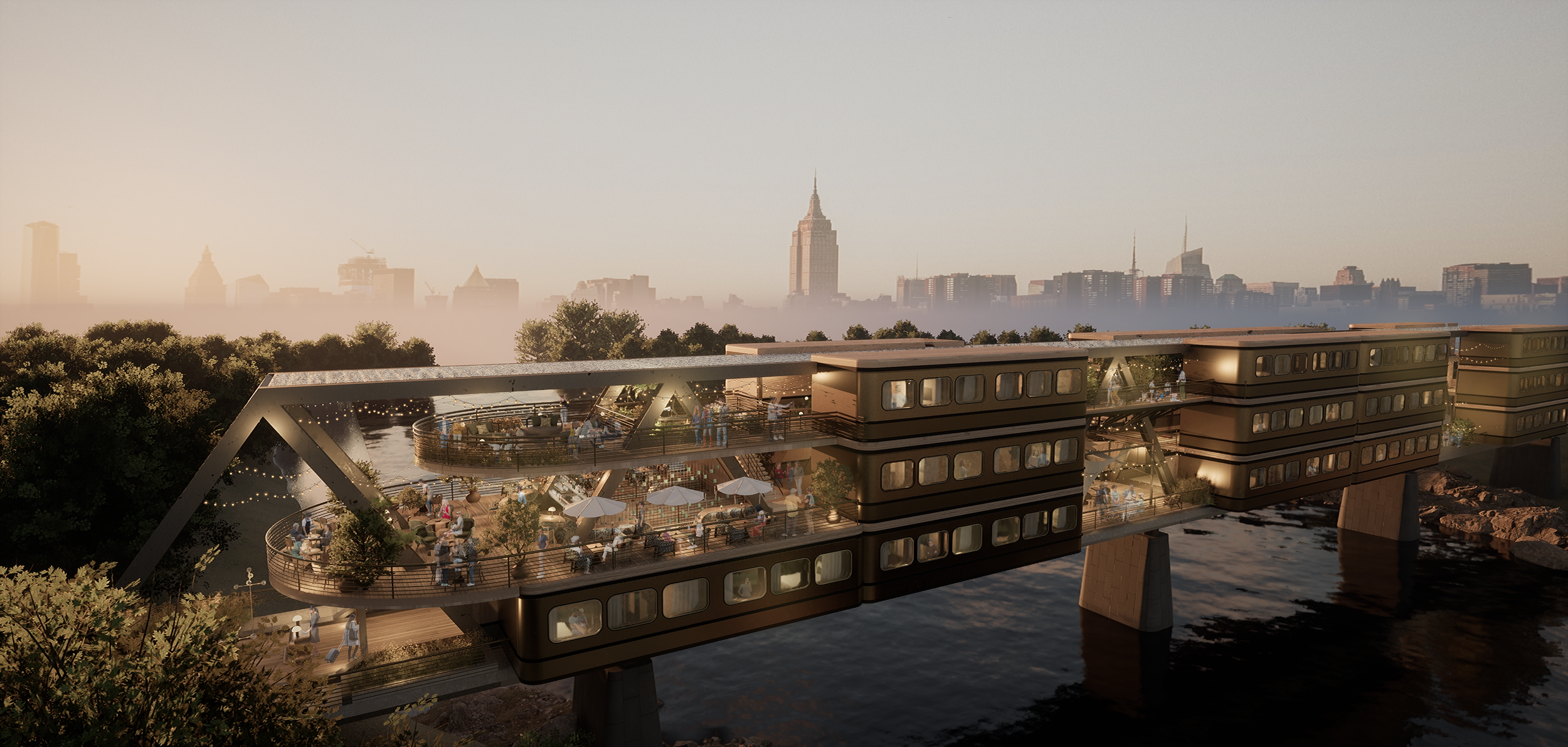 The Passage is an innovative adaptive reuse project that transforms abandoned railway bridges into immersive hospitality destinations, reducing the need for new construction. Featuring cantilevered guest pods, skywalks, and rooftop gardens, the design celebrates original trusses while operating as a closed-loop system powered by solar, wind, and rainwater. Adaptable to diverse sites, it offers a first-of-its-kind experience that combines sustainability, architectural heritage, and a deep connection to nature.